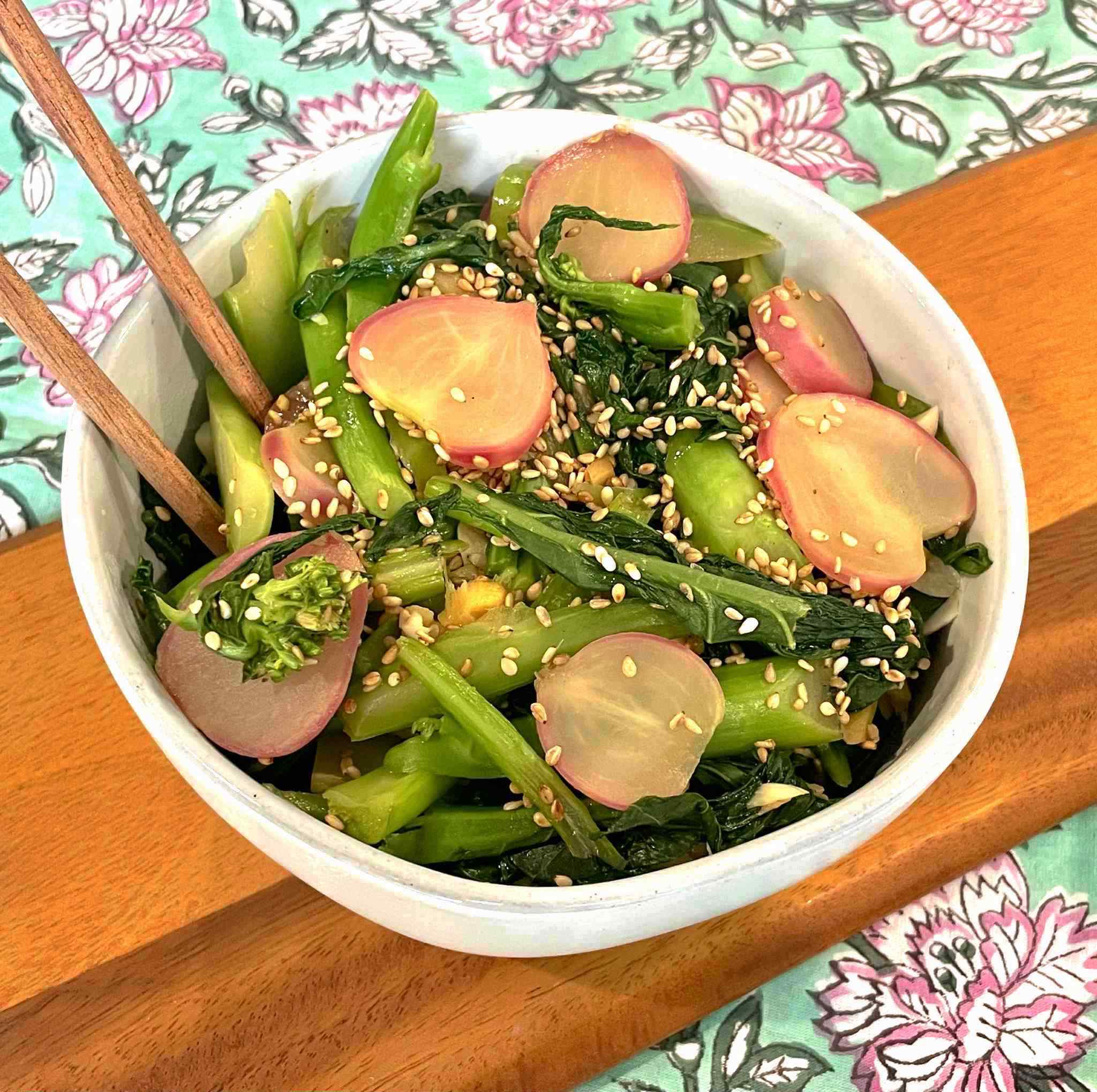 An easy colorful side dish with a salty sweet umami base and layers of fragrant flavor from fresh garlic and ginger.